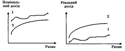 Оскільки при розрахунку процентних ставок за державними цінними паперами використовуються очікувані чи прогнозовані рівні інфляції, на час виплати процентів такі папери можуть мати реальну дохідність, яка дорівнює нулю, або приносити збитки. Схематично залежність рівня доходу за різними фінансовими активами від ступеня їх ризиковості показано на рис. 12.1. Крива 1 відображає дохідність фінансових активів, які перебувають у обігу на фінансових ринках, що знаходяться в стадії формування, а крива 2 — на розвинених фінансових ринках.