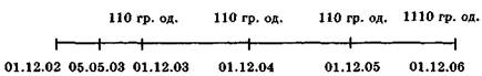1. Очікувані грошові потоки за цією облігації складаються з чотирикратних купонних виплат у розмірі 110 гр. од. та суми 1000 гр. од., яку отримає власник облігації 01.12.06 р. при її погашенні.
