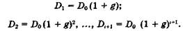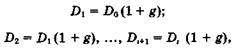 Постійний коефіцієнт g називають коефіцієнтом зростання, а дивіденди — дивідендами з постійним коефіцієнтом зростання. Якщо останні сплачені дивіденди становлять D0, очікувані дивіденди — Д, дивіденди за і-й період дорівнюють Аі( взаємозв'язок між дивідендними виплатами за різні періоди матиме вигляд: