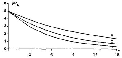 Теперішня вартість постійних дивідендних виплат різко зменшується при зростанні часового проміжку. Теперішня вартість дивідендів з постійним коефіцієнтом зростання не має такого стрімкого падіння завдяки постійному зростанню дивідендів з часом. Теперішню вартість очікуваних дивідендних виплат протягом наступних 15 років при постійних дивідендах D = 5 гр. од. (крива 1) та дивідендах з постійним коефіцієнтом зростання g = 5, 10% та очікуваною дохідністю кa= 20% (криві 2, 3) подано на рис. 13.2.