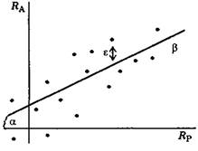 Для того щоб виявити характер взаємозв'язку між дохідністю окремої акції та ринковою дохідністю, застосовують регресійний аналіз. Залежність між ринковою дохідністю RP, що може відображатись одним із ринкових індексів, та дохідністю акцій деякої корпорації А показано на рис. 13.8. За допомогою методу найменших квадратів будують пряму, яка мінімізує суму квадратичних відхилень точок від прямої. Величина є характеризує віддаль від точок до прямої, а є довжиною відрізку, яку відтинає пряма на вертикальній осі. Коефіцієнт Р є тангенсом кута нахилу прямої. Він характеризує чутливість акцій А до ринкової дохідності. Якщо р = 1 (кут нахилу — 45°), зміни в дохідності акції корпорації А дорівнюють змінам ринкової дохідності. Якщо, наприклад, середня дохідність на ринку зросла на 0,5%, дохідність акцій А також збільшиться на 0,5%.