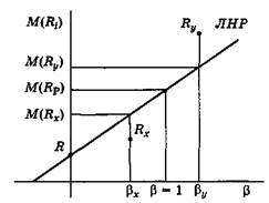 Коефіцієнт β, як і ринковий ризик, розраховують на основі даних за попередні місяці та роки. Отримані дані використовують для оцінювання активів згідно з МОКА. Маючи інформацію за попередні роки, інвестор може оцінити коефіцієнт р окремої компанії. З допомогою коефіцієнта β інвестор може, користуючись ЛНР, оцінити потрібну ставку доходу, яку має забезпечити акція компанії. Для багатьох компаній, акції яких перебувають в обігу на ринку, відомі коефіцієнти р. Порівнюючи ці коефіцієнти β з дохідністю, яку пропонують корпорації, учасники ринку можуть зробити висновки про те, недооцінені чи переоцінені акції. Припустимо, що βх, βy — коефіцієнти β для корпорацій X,Y, a Rx Ry — дохідність акцій X,Y (рис. 13.9.).