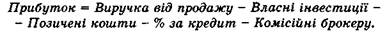 Приклад. У купівлю 1000 акцій за ціною 10 дол. США інвестор вкладає 5000 дол. США власних коштів і 5000 дол. СІЛА коштів, позичених під 12% річних. Комісійні брокера — 70 дол. Через 3 міс., коли курс акцій піднімається до 13 дол, інвестор продає акції. Прибуток від проведення спекулятивної угоди з акціями розраховують так: