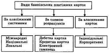 Загальну класифікацію банківських платіжних карток подано на рис. 14.1. За схемою розрахунків платіжні картки поділяють на дебет-ні, кредитні та електронні гаманці. Дебетні картки забезпечують власникам доступ до їх депозитних рахунків та списання коштів у межах залишків на цих рахунках, тобто дають змогу розпоряджатися картрахунком у межах залишку коштів на ньому. Доступ до депозитних рахунків здійснюється через пристрої видачі готівки або спеціальні пристрої в торгових точках. Деякі різновиди дебетних карток дають змогу власникам вносити готівкові кошти на депозитний рахунок.