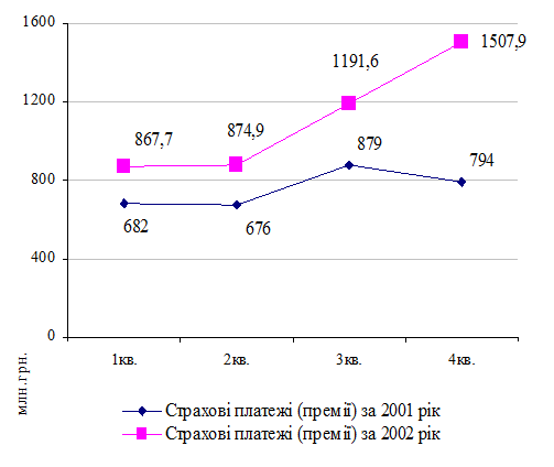 Загальний обсяг зібраних страхових премій у 2001-2002 рр., млн. грн.