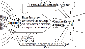 Рис. 9. Система грошових і матеріально-енергетичних потоків конверсії природного ресурсу у споживну вартість і відходи: