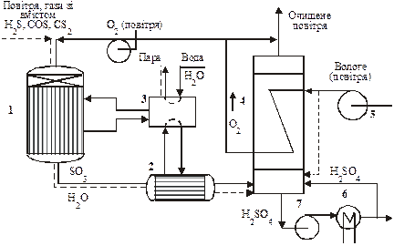 1 — конвертер H2S ® SO3 + H2О; 2 — теплообмінник; 3 — система охолодження розплаву солей конвертера і генерації пари; 4 — башта конденсації SO3 + H2O в товарну сірчану кислоту; 5 — повітродувка; 6, 7 — насоси системи підвищення концентрації кислоти.