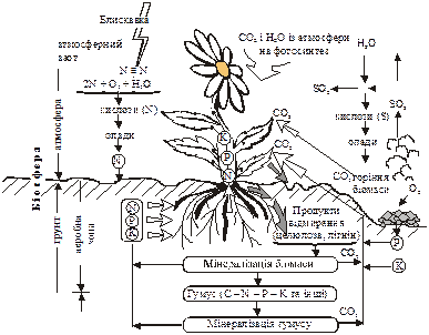 Рис. 33. Схема кругообігу речовин у процесах фотосинтезу і мінералізації речовин рослиною