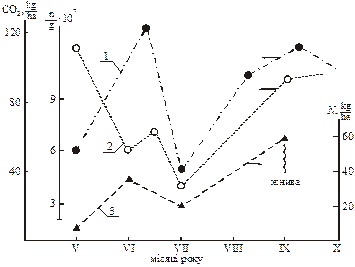 1. Кількість діоксиду вуглецю, вивільненого з одного гектара — СO2, kg/ha. 2. Кількість мікроорганізмів (n) в одному грамі грунту, n/g. 3. Кількість азоту, засвоєного рослинами N, kg/ha.