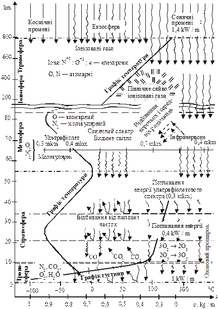 Температура атмосфери тричі змінює градієнт: у стратосфері на висоті 20…30 km, у верхніх шарах стратосфери на межі з мезосферою (50…60 km) і остаточно починає підвищуватись на межі з іоносферою (80 km). На висоті 100 km температура переходить через 0°С і швидко зростає. Це пояснюється високою швидкістю молекул у дуже розрідженому просторі, де вони не втрачають її через зіткнення. Але теплоємність такої атмосфери також дуже мала, відтак це не перешкоджає перебуванню на такій висоті космічних апаратів. Параметри атмосфери зображено на рис. 21.