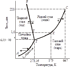 За будь-яких значень температури і тиску, які відповідають точкам діаграми в площі, обмеженій кривими ВТ і СТ, вода існує тільки в рідкому стані, у точках нижче кривої АТ і у точці Т — у вигляді пари. Точки на кривих відповідають умовам, за яких дві суміжні фази перебувають у рівновазі. Дві точки на діаграмі особливо цікаві. Точка Т (273,16 К і 6,03 · 10–3 atm) називається потрійною точкою, де в рівновазі перебувають одночасно три фази: пара, вода і лід. Точка С (647 К і 220 atm) називається критичною. За температури, більшої за 647 К, водяну пару не можна перетворити на рідину за будь-якого підвищення тиску. Інакше кажучи, за температури і тиску, вищих ніж у точці С, водяна пара й рідка вода не розрізняються. Між ними не існує фазової межі. Діаграма стану води відіграє виключно важливу роль у вивченні природних процесів біосфери, за проектування й експлуатації парових котлів, енергетичних турбін, енергосистем, автоклавів тощо.