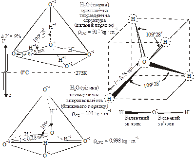 Молекули води, маючи значний дипольний момент, можуть взаємодіяти одна з одною, утворюючи так звані водневі зв’язки. Однак у фазі пари вода в основному одномолекулярна: атоми водню і кисню зв’язані ковалентно. У рідкому і твердому станах кожна молекула утворює чотири водневі зв’язки, з яких два — як донор протонів (Н+1) і два — як акцептор протонів. Усі чотири водневі зв’язки молекули води спрямовано (рис. 23) приблизно до вершин правильного тетраедра (або перехресних кутів протилежних граней куба).