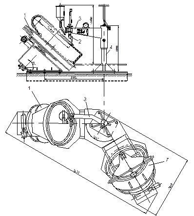 Обидва кільцевих шва виробу зварюються одночасно двома голівками, підвішеними на загальній каретці 1. При переході зварювальника з одного робочого місця на інше обидві голівки одночасно піднімаються за допомогою важеля 2 і каретка пересувається на інше робоче місце до фіксуючого упора. Вироби подаються й убираються з установки накатом, двома паралельними потоками - по числу робочих місць. Для полегшення установки виробу в центрові шайби кожен обертач оснащений важільним пристроєм 3 з піднімальними роликами, за допомогою яких виріб легко встановлюється на лінію центрів і заправляється в передню бабку обертача. Після цього подається стиснене повітря в пневмоциліндр задньої бабки 4, і виріб фіксується в центрових шайбах.