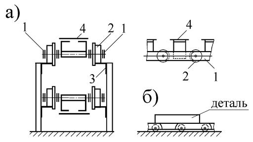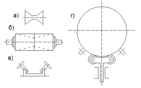 Для транспортування виробів циліндричної форми застосовують криволінійні (рис 11,а), біконічні (рис 11,б), або розташовані під кутом парні циліндричні ролики (рис 11,в). При необхідності повороту виробу навколо поздовжньої осі, використовують піднімальні парні ролики (рис 11,г).