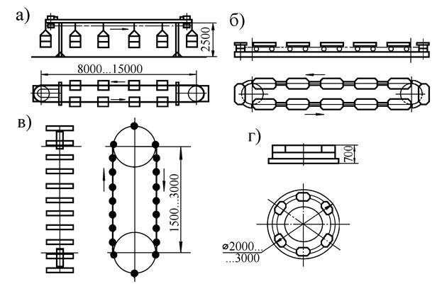 Можливі варіанти компонування конвейєрних пристроїв у вигляді роликових або ланцюгових підлогових транспортерів на основі циркуляційних горизонтально- (рис. 8, а та б) і вертикально-замкнутих (рис 8,в) конвейєрів і роторних накопичувачів (рис. 8,г).