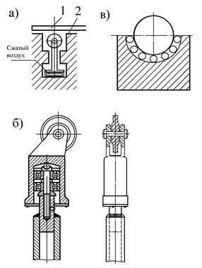 Під дією стиснутого повітря ролик піднімається і піднімає лист 1 над поверхнею складального стенда 2. Переміщення листів у цьому випадку здійснюють за допомогою тягового пристрою. Для розвороту листів або для зміни напрямку переміщення можуть використовуватися ролики на поворотних опорах (рис.9,б) або кульові опори (рис 9,в).