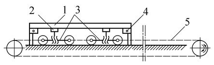 У цьому випадку візки облаштовують піднімальними механізмами (домкратами). Схема такого крокового конвейєра на зчепі візків показана на рис 14. Вузол 1 подається на перше робоче місце за допомогою мостового крана й укладається на опори 4. Після завершення всіх робіт на цьому робочому місці, домкрати 2 піднімають вузол над поверхнею опор і за допомогою візків 3, що приводяться у рух тяговим елементом 5, переміщають вузол на інше робоче місце. Після цього домкрати опускаються, вузол розміщається на опорах іншого робочого місця, а візки повертаються у вихідне положення. Для ефективного використання крокових конвейєрів необхідно розподіляти виробничі операції на кожному робочому місці таким чином, щоб їхня трудомісткість була приблизно однаковою. При такому підході лінія буде синхронізованаі і простої вузла на якомусь з робочих місць будуть виключені.