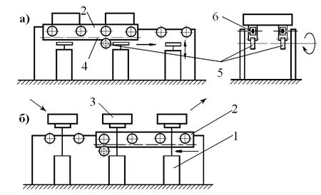 Одним з різновидів крокових конвейєрів є конвейєри з піднімальними столами (рис 15.). Піднімальні столи в таких засобах технологічного оснащення встановлюються на кожній позиції. Деталі 3 розміщені на рухомих напрямних 2 і при їхньому робочому ході переміщаються на розмір кроку.