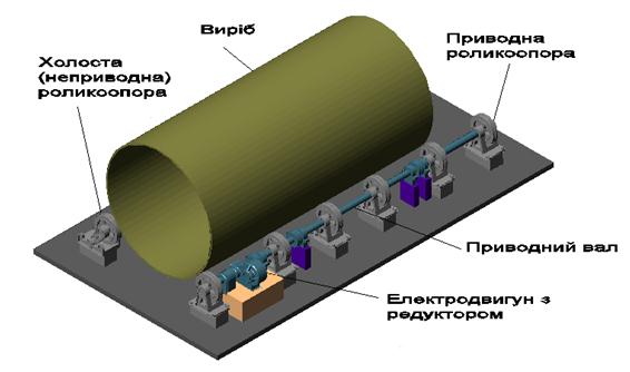 Роликові обертачі складаються з рядів роликоопор (холостих і приводних), змонтованих на загальній рамі. Кількість роликоопор визначається габаритами виробу. Типова компонувальна схема роликового обертача представлена на рис. 10.