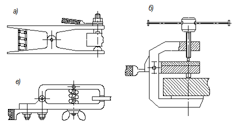 а – пружинний; б – гвинтовий; в – гвинтова струбцина.