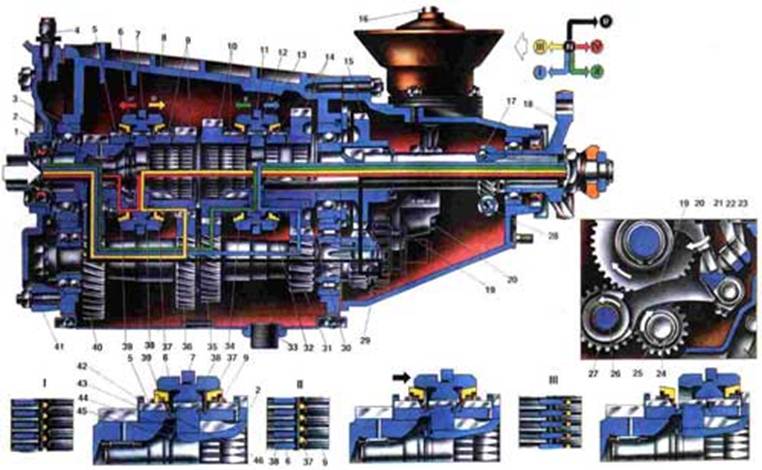 Робота коробки передач 1. Первинний вал; 2. Вторинний вал; 3. Шестерня постійного зачеплення первинного валу; 4. Сапун; 5. Зубчатий вінець синхронізатора IV передачі; 6. Ковзаюча муфта синхронізатора III і IV передач; 7. Вилка перемикання III і IV передач; 8. Картер коробки передач; 9. Шестерня і зубчатий вінець синхронізатора III передачі; 10. Шестерня і зубчатий вінець синхронізатора II передачі; 11. Вилка перемикання I і II передач; 12. Маточина муфти синхронізатора I і II передач; 13. Ковзаюча муфта синхронізатора I і II передач; 14. Шестерня і зубчатий вінець синхронізатора I передачі; 15. Шестерня заднього ходу; 16. Важіль перемикання передач; 17. Провідна шестерня приводу спідометра; 18. Фланець еластичної муфти; 19. Вилка включення заднього ходу; 20. Шток вилки включення заднього ходу; 21. Шток вилки включення III і IV передач; 22. Шток вилки включення I і II передач; 23. Обмежувальний гвинт включення I і II передач; 24. Проміжний вал; 25. Шестерня заднього ходу проміжного валу; 26. Вісь проміжної шестерні заднього ходу; 27. Проміжна шестерня заднього ходу; 28. Ведена шестерня приводу спідометра; 29. Задня кришка коробки передач; 30. Втулка шестерні I передачі; 31. Шестерня I передачі проміжного валу; 32. Блокуюче кільце синхронізатора I передачі; 33. Пробка зливного отвору; 34. Блокуюче кільце синхронізатора II передачі; 35. Шестерня передачі проміжного валу; 36. Шестерня III передачі проміжного валу; 37. Блокуюче кільце синхронізатора III передачі; 38. Маточина синхронізатора III і IV передач; 39. Блокуюче кільце синхронізатора IV передачі; 40. Шестерня постійного зачеплення проміжного валу; 41. Картер зчеплення; 42. Пружина блокуючого кільця синхронізатора; 43. Наполеглива шайба пружини; 44. Тарілчаста пружина; 45. Стопорне кільце маточини синхронізатора; 46. Стопорне кільце блокуючого кільця синхронізатора; 47. I. Нейтральне положення; 48. II.Начало включення третьої передачі; 49. III. Повне включення третьої передачі.