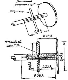 ДС вібратора без рефлектора має два пелюстки в площині осі з максимами в протилежних напрямках [1]. Для створення однонаправленого випромінювання використовують пасивний рефлектор. Застосування дискового рефлектора забезпечує створення ДС з майже осьовою симетрією, тобто F(ψ,ξ) = F(ψ) (ψ,ξ – полярні кути). Для створення одно направленої ДС вібратор розміщують на відстані приблизно 0,25λ відносно вібратора. Електромагнітна хвиля відбивається від рефлектора зі зсувом фази на 180° і так як проходить лишній проміжок шляху, довжиною в півхвилі (від вібратора до рефлектора і назад), складується в фазі з хвилею, що поширюється від вібратора. Таким чином, напруженість поля в бік рефлектора майже дорівнює нулю, а в протилежному напрямку – подвоюється. В результаті створюється ДС з одним максимумом в напрямку, перпендикулярному площині рефлектора.