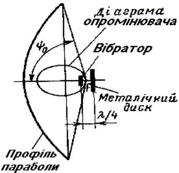 Рисунок 3 – Вібратор з дисковим Рисунок 4– Розміщення опромінювача . рефлектором. відносно параболи.
