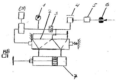 Подачу стиснутого повітря забезпечує крань, через фільтр 5 поступає на редуктор 4, далі на масленку 3 і поступає в середню порожнину пнемо реле 2, яке керує рухом пневмоцеліндра 7.