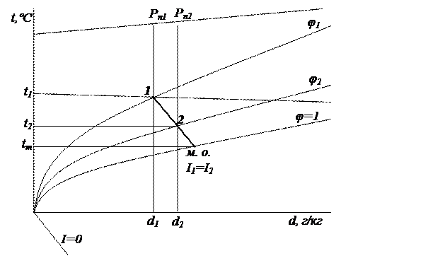 Інші параметри агента сушіння на виході зі штабелю визначають за допомогою побудови ліній процесу сушіння на Id - діаграмі (рис.2.1). Точку 1, яка характеризує стан агента сушіння на вході в штабель, знаходимо за t1, φ1. Точку 2, яка характеризує параметри агента сушіння на виході зі штабелю, знаходимо на перетині ліній І=const (I1=I2) , яка виходить з точки 1, з лінією d2=const.