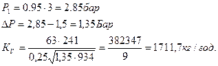 Р1 =0,95Р=0,95·3,0=2,85 бар; Р1 - абсолютний тиск пари перед калорифером, тобто на колекторі камери переважно задається, або береться за даними виробництва; Р2 - абсолютний тиск конденсату після конденсатовивідника, (тиск в конденсаційній магістралі 1,5 бар).