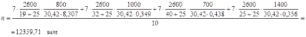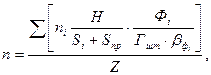 де ni — кількість прокладок в одному ряді, визначають за табл. 28 для кожного виду висушуваного матеріалу; Н — висота штабеля, мм; Фi — об'єм фактичного матеріалу, що підлягає сушінню для кожного виду матеріалу; Si — товщина висушуваного матеріалу, мм; Sпр — товщина прокладок; Гшт — габаритний об'єм одного штабеля; βфі — об'ємний коефіцієнт заповнення штабеля, для кожного виду матеріалу визначений в технологічному розрахунку; Z — оборотність прокладок.