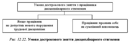стягненню, то вважається, що працівник не мав дисциплінарного стягнення. Річний строк обчислюється з дня накладання стягнення — дня повідомлення працівникові під розписку про оголошення дисциплінарного стягнення (ст. 149 КЗпП). • Дисциплінарне стягнення може бути зняте достроково за наявності відповідних умов (рис. 12.22).