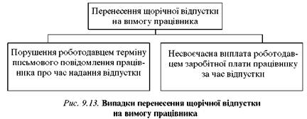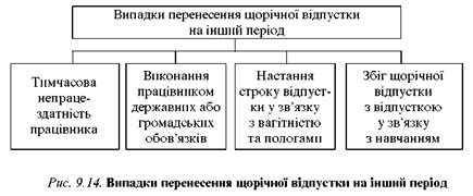 Законодавством передбачено випадки, коли щорічна відпустка переноситься на інший період або продовжується (рис. 9.14).