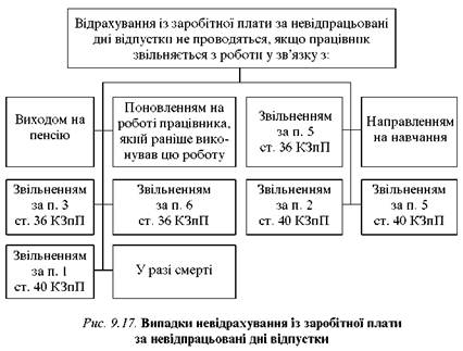 • у разі звільнення працівника до закінчення робочого року, за який він уже одержав відпустку повної тривалості, для покриття його заборгованості власник або уповноважений ним орган провадить відрахування із заробітної плати за дні відпустки, що були надані в рахунок невідпрацьованої частини робочого року; Відрахування не провадиться, якщо працівник звільняється з ро-боти у зв’язку із зазначеними у ст. 22 Закону підставами (рис. 9.17).