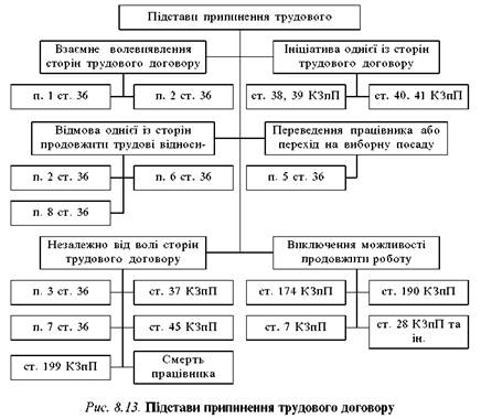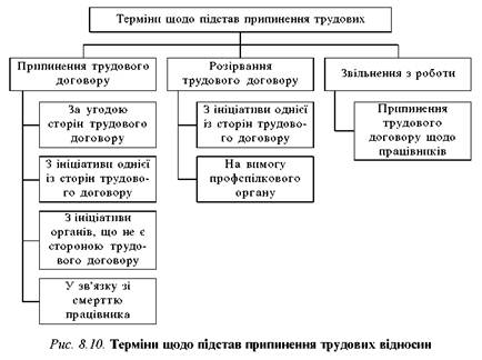 У законодавстві про працю України щодо припинення трудових відносин застосовуються терміни "припинення трудового договору", "розірвання трудового договору", а також "звільнення з роботи" (рис. 8.10).
