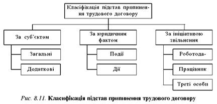 Підстави припинення трудового договору класифікують за критеріями, наведеними на рис. 8.11.