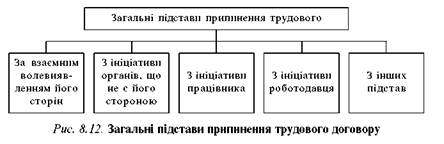 Загальні підстави припинення трудового договору визначені у ст. 36 КЗпП. Залежно від того, хто є ініціатором припинення трудового договору, такі підстави поділяють на чотири групи (рис. 8.12).