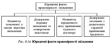 Звільнення працівника буде правомірним, якщо одночасно наявні юридичні факти, обставини (рис. 8.14):