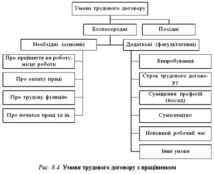Умови, вироблені сторонами при укладенні трудового договору (безпосередні), у свою чергу, поділяються на обов’язкові (необхідні), без яких трудовий договір не може бути укладений, і додаткові (факультативні), не обов’язкові для існування трудового договору (рис. 8.4).