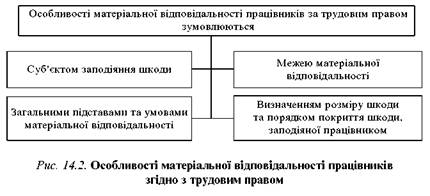 Особливості матеріальної відповідальності працівників за трудовим правом зумовлюються певними факторами і відображені на рис. 14.2.