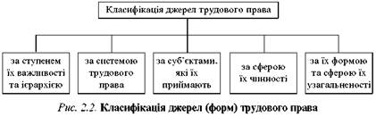 Класифікація і види джерел трудового права. Джерела трудового права класифікують за різними критеріям (рис. 2.2). Враховуючи те, що правотворча діяльність у сфері праці здійснюється різними органами держави, класифікація джерел трудового права здійснюється органами, які приймають нормативні акти різної юридичної сили.