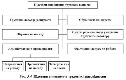 Отже, підставою для виникнення трудових відносин є визначений законом юридичний факт, а також інші послідовно здійснювані складні юридичні факти. Наприклад, обрання за конкурсом, призначення на посаду, направлення на роботу службою зайнятості тощо.