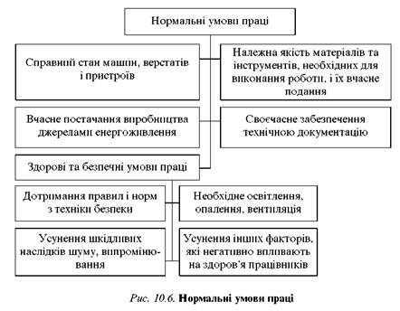 У ст. 88 КЗпП дається перелік нормальних умов праці, які потрібно враховувати при розробці норм виробітку (норм часу) і норм обслуговування. Нормальними вважаються умови праці, наведені на рис. 10.6.