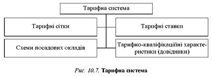 Тарифна система та її елементи. Основою організації оплати праці є тарифна система (рис. 10.7). Тарифна система оплати праці використовується для розподілу робіт залежно від їх складності, а працівників — залежно від їх кваліфікації та за розрядами тарифної сітки. Вона є основою формування та диференціації розмірів заробітної плати.