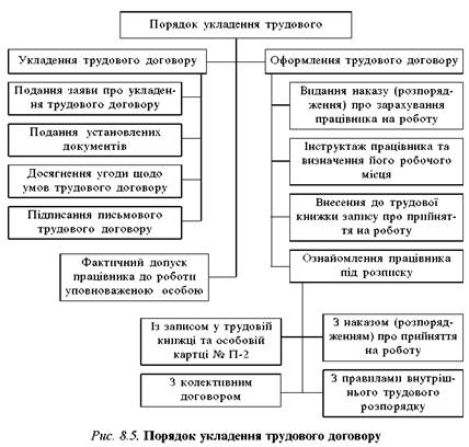 Зауважимо, що трудовий договір вважається укладеним і тоді, коли наказ чи розпорядження не були видані, але працівника фактично було допущено до роботи. Стадії укладення та оформлення трудового договору показано на рис. 8.5.