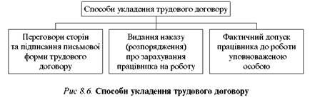 Таким чином, ст. 24 КЗпП визначено три способи укладення трудового договору (рис 8.6).