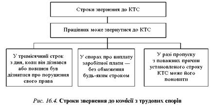 Строки звернення до КТС. Строки звернення до комісії з трудових спорів встановлено ст. 225 КЗпП. Необхідно врахувати, що працівник може звернутися до комісії з трудових спорів у тримісячний строк з дня, коли він дізнався або повинен був дізнатися про порушення свого права, а в спорах про виплату належної йому заробітної плати — без обмеження будь-яким строком (рис. 16.4).