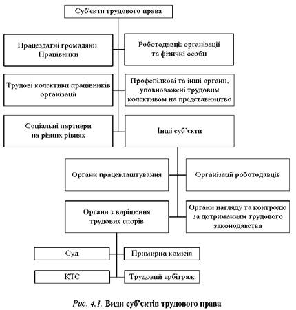 Поняття, види суб'єктів трудового права. Суб'єктами права є учасники суспільних відносин, які на підставі чинного законодавства мають суб'єктивні права й обов'язки. Кожна галузь права характеризується своїм колом суб'єктів права (рис. 4.1).