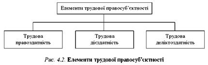 Необхідною умовою для виникнення трудових відносин є трудова правосуб'єктність. Згідно з трудовим правом громадянин володіє єдиною трудовою прав о дієздатністю та де лікто здатністю — здатністю мати й здійснювати трудові права й обов'язки, нести відповідальність за трудові правопорушення. Всі ці елементи виникають одночасно й називаються трудовою правосуб'єктністю (рис. 4.2).