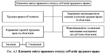 Правовим статусом суб’єкта трудового права називається його основне правове становище, закріплене трудовим законодавством. Змістом правового статусу суб’єктів є такі елементи (рис. 4.3).
